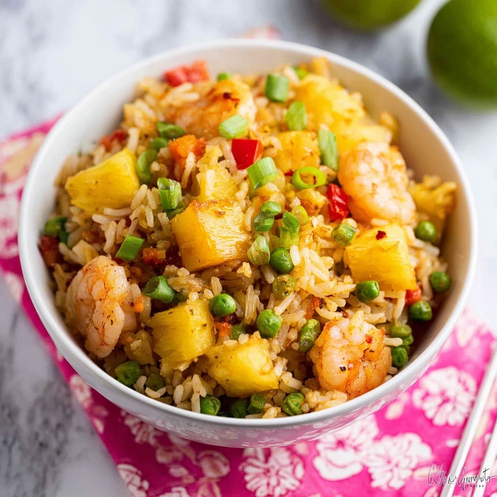 A vibrant and flavorful 30-minute pineapple shrimp fried rice that combines juicy shrimp, sweet pineapple, colorful red peppers, and fragrant curry powder for a quick and satisfying meal perfect for any weeknight.