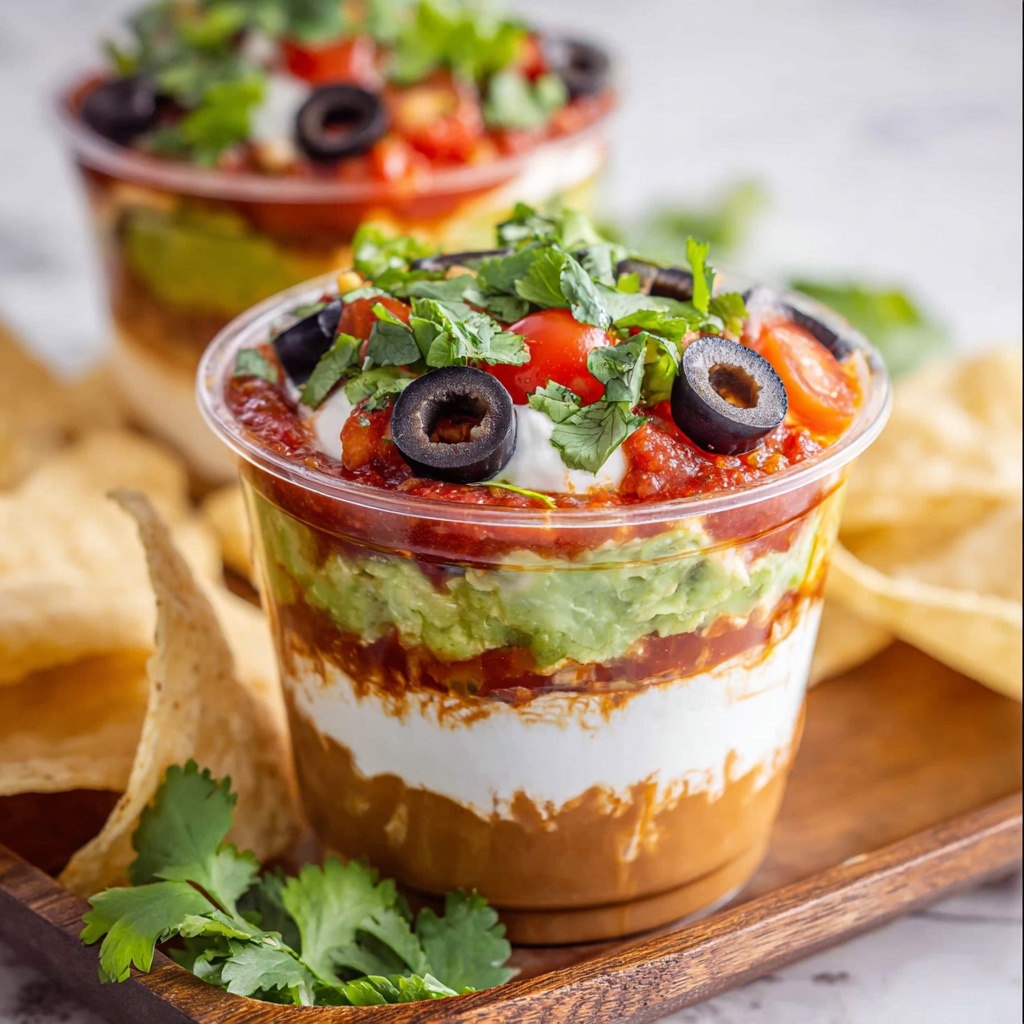 This 7 Layer Dip Cups recipe offers a fun and convenient twist on the classic party dip, featuring layers of seasoned refried beans, creamy guacamole, tangy sour cream, chunky salsa, shredded cheese, and fresh toppings, all served in individual clear cups for easy sharing and portion control. Perfect for gatherings, game days, or casual snacking with tortilla chips.