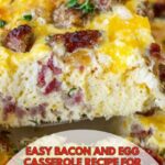 This Bacon and Egg Casserole Recipe also freezes wonderfully. After baking and cooling completely, cut it into portions and wrap each piece tightly with foil before placing them in a freezer-safe container. Frozen casserole keeps fresh for up to 2 months.