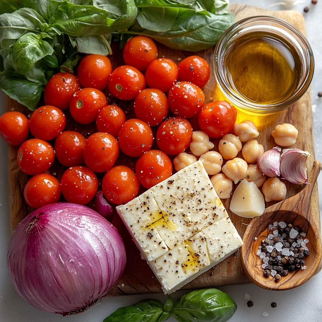 - Combine Ingredients: In a baking dish, mix the rinsed chickpeas, cherry tomatoes, and chopped red onion to form the base of the dish.