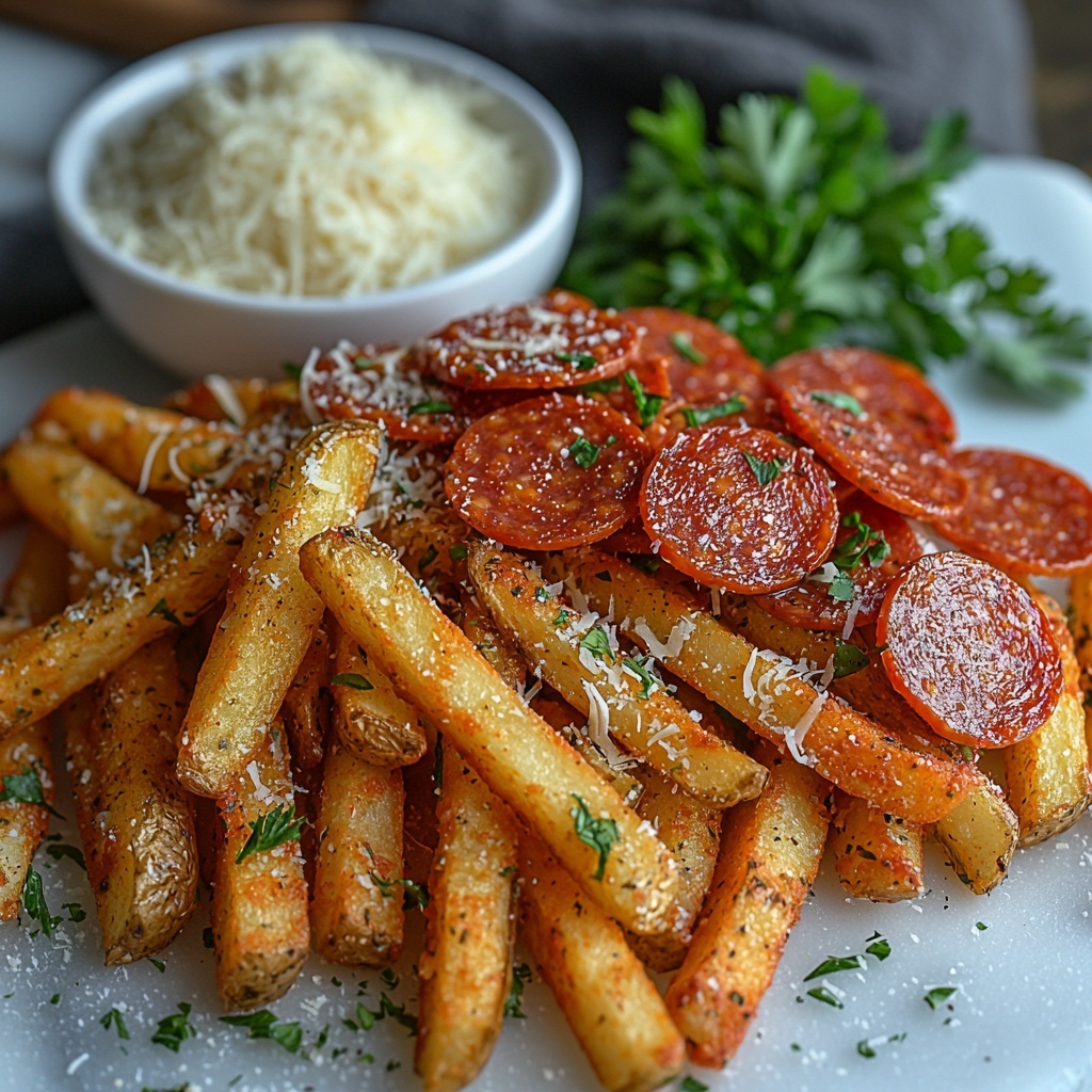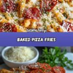 Baked Pizza Fries combine crispy golden fries with classic pizza toppings like marinara sauce, mozzarella, parmesan, and pepperoni, creating a delicious and easy-to-make appetizer or snack perfect for sharing.