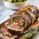This Baked Stuffed Flank Steak Recipe pairs wonderfully with creamy mashed potatoes or garlic roasted vegetables. Crisp salads or lightly sautéed green beans with almonds provide refreshing contrasts to the rich flavors of the stuffed steak.