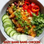 A vibrant and flavorful Bang Bang Chicken Salad featuring warm shredded chicken tossed in a creamy peanut butter dressing with a hint of sriracha, served over a bed of fresh mixed greens, cucumber, red onion, carrots, cilantro, and topped with crunchy peanuts and sesame seeds. This quick and easy salad combines savory, spicy, and tangy flavors with a satisfying crunch, perfect for a light lunch or dinner.