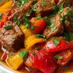 This Best Ever Pepper Steak Recipe features tender beef stew meat coated in seasoned flour, seared with bell peppers and garlic, then slowly cooked in a blend of stewed tomatoes, beef broth, and Worcestershire sauce. The result is a hearty, flavorful dish perfect for a comforting family meal.
