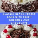 This classic Black Forest Cake features light and airy chocolate sponge layers soaked with cherry liqueur, layered generously with fresh bing cherries and whipped cream, then decorated with rich dark chocolate and whole cherries. A luscious, indulgent dessert perfect for special occasions.
