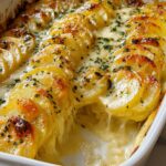 Cheesy Scalloped Potatoes is a classic American side dish featuring tender Yukon Gold potatoes baked in a creamy, flavorful cheese sauce made with sharp cheddar and Parmesan. This comforting casserole is perfect for holidays or family dinners, layering thinly sliced potatoes with a rich cream sauce infused with sautéed onions, garlic, and herbs, then baked until golden and bubbly.