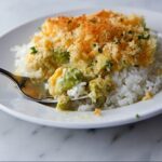 A comforting Chicken and Broccoli Stuff casserole featuring tender broccoli, shredded chicken, and a creamy cheesy sauce topped with a crispy buttery panko breadcrumb crust. Baked to bubbly perfection, it’s served over hot rice making it a hearty family-friendly meal.