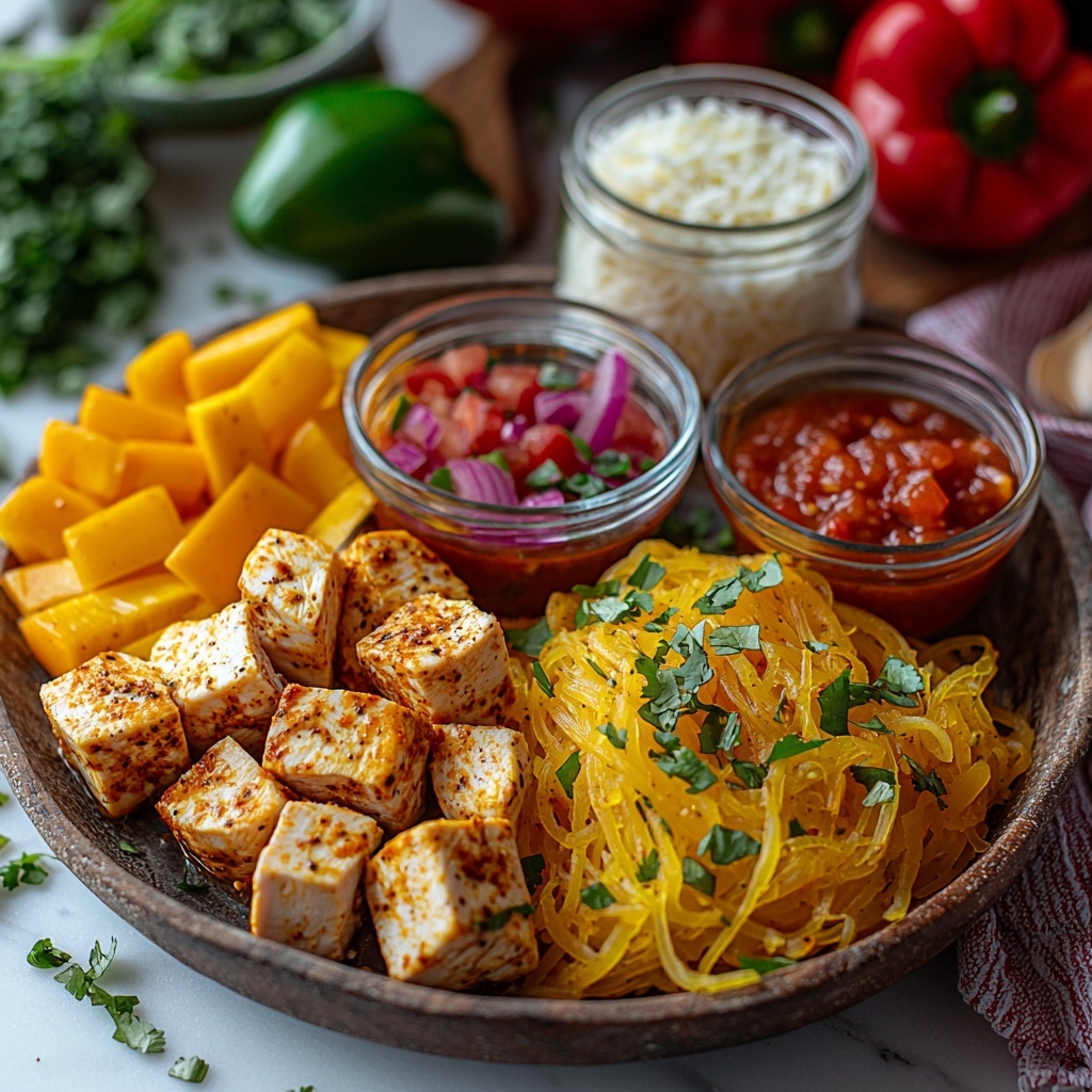 Serving the filling inside the spaghetti squash halves is already stunning, but for a fun twist, you can shred the squash strands fully and mix them with the chicken fajita filling in a large casserole dish, then bake. Alternatively, turn the filling into fajita-stuffed bell peppers for a colorful, hand-held option. The Chicken Fajita Spaghetti Squash Bowls Recipe opens the door to lots of playful presentation ideas!