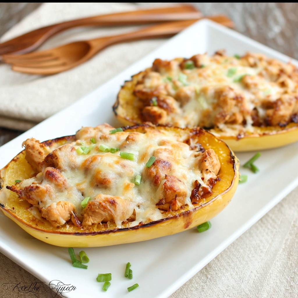 Once your roasted squash is done, carefully flip the halves cut-side up. Scoop generous portions of the chicken and veggie filling into each half. If necessary, you can trim some squash fibers to fit more filling—the deliciousness is worth it! Top each bowl with the remaining cheddar cheese for that irresistible melty blanket.