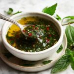 Remove the pan from heat and let the butter mixture cool for at least 5 minutes. This cooling period is important because adding fresh herbs and acidic vinegar or lemon juice to very hot butter can cause bitterness and loss of vibrant flavors. Once slightly cooled, stir in the finely minced parsley, oregano, and red wine vinegar. These lively, fresh ingredients bring brightness, herbal complexity, and a subtle tang that perfectly balance the buttery richness.