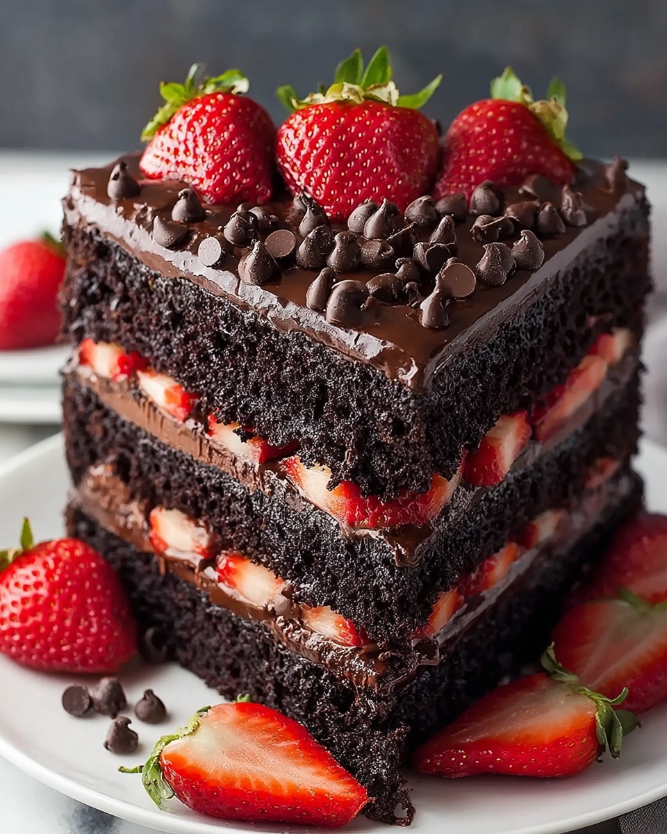 A rich and moist chocolate cake infused with fresh strawberries and chocolate chips, topped with your favorite frosting and decorated with strawberries and chocolate drizzle. Perfect for special occasions or candy lovers looking for a fruity twist in their dessert.