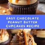 Delight in these rich and moist Chocolate Peanut Butter Cupcakes, featuring a perfectly balanced chocolate base topped with a creamy peanut butter frosting. Garnished optionally with chopped mini Reese’s peanut butter cups, these cupcakes are a decadent treat perfect for any occasion.