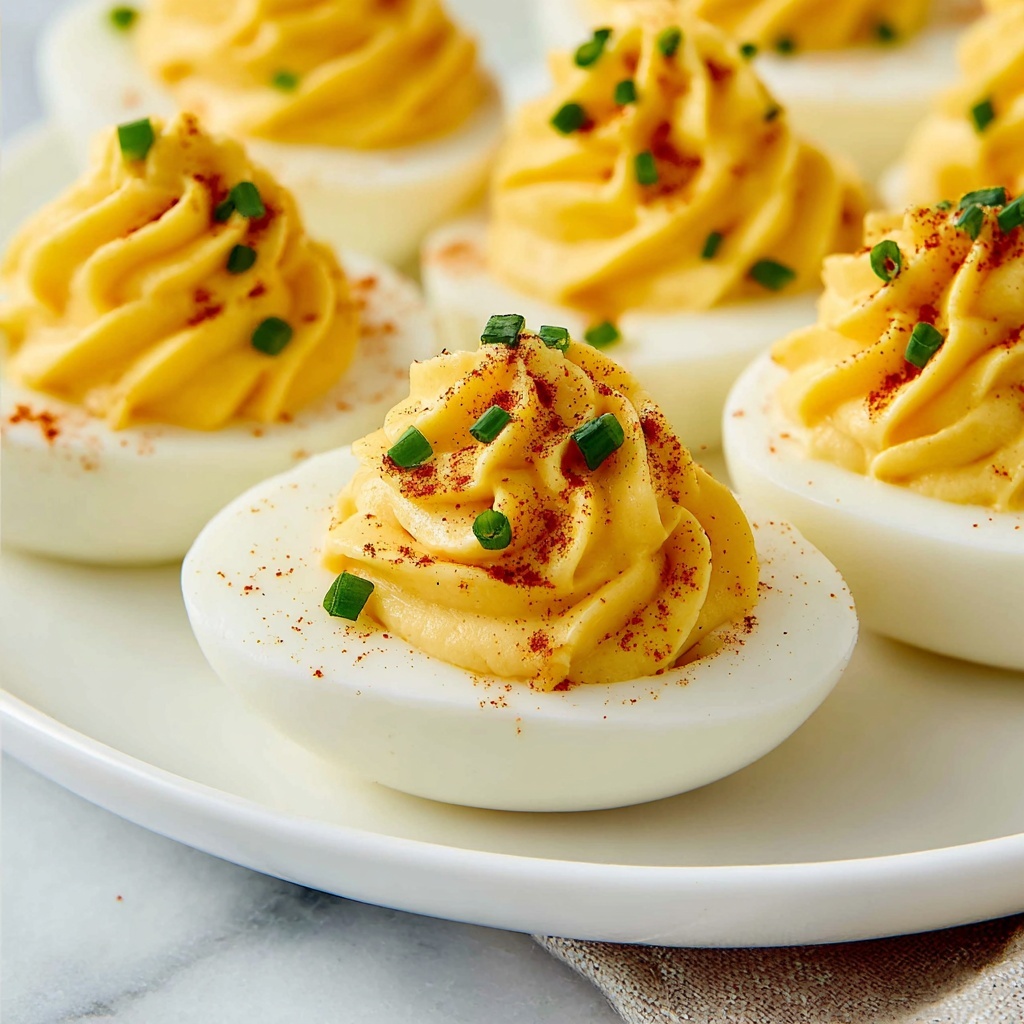 Sprinkle ground paprika generously over each deviled egg and scatter some freshly chopped chives on top. These garnishes do more than decorate; they infuse a hint of smoky sweetness and fresh herbal notes, rounding out the flavor and making each bite unforgettable.
