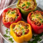 Classic Stuffed Bell Peppers feature colorful bell peppers filled with a savory mixture of ground beef, rice, tomatoes, and Italian seasoning, topped with melted cheese and fresh parsley. This comforting baked dish makes a perfect family meal that’s both flavorful and satisfying.