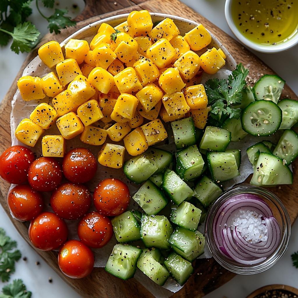 Place all the fresh ingredients—corn, avocado cubes, quartered cherry tomatoes, diced cucumber, finely chopped cilantro, and thinly sliced red onion—into a large bowl. This step is where the magic begins as all the textures and colors come together in harmony.