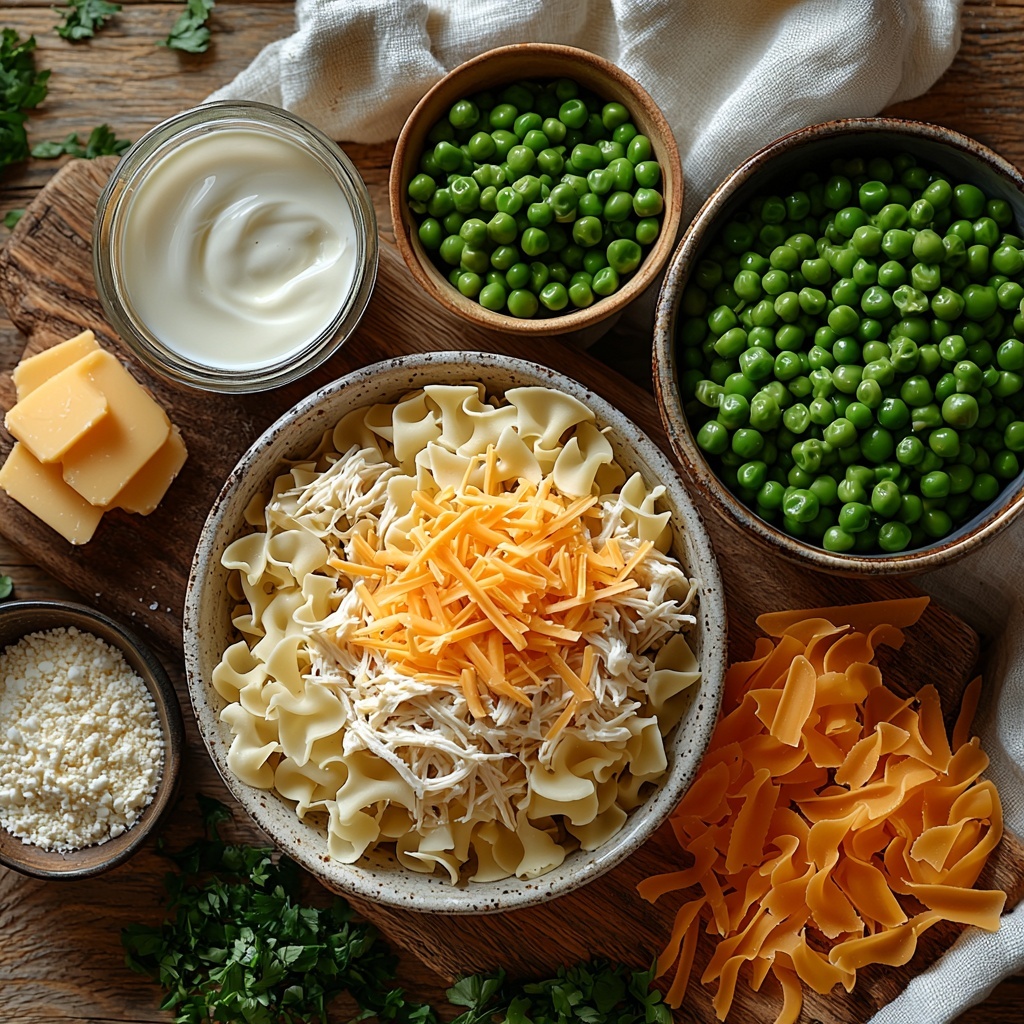 - Combine ingredients: Fold the cooked noodles, shredded chicken, and frozen peas and carrots into the creamy mixture until all components are evenly combined.