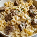 This Creamy Beef and Bowtie Pasta is a hearty and comforting dish that combines tender ground beef with aromatic herbs, garlic, and a luxuriously creamy Parmesan sauce tossed with perfectly cooked bowtie pasta. Ideal for a satisfying family dinner, it offers rich flavors and a smooth texture that will please any pasta lover.