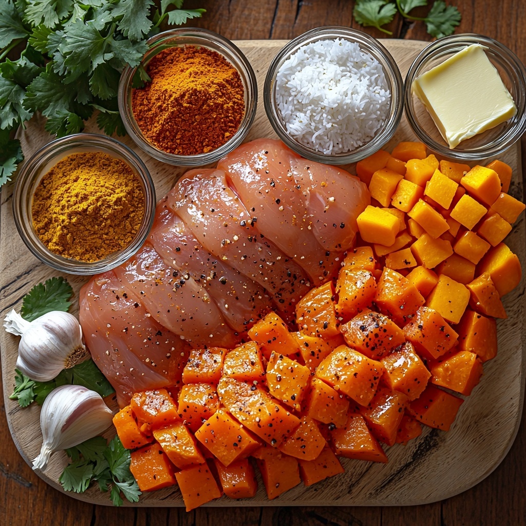 Next, toss in the butter or olive oil and crushed garlic, stirring to combine with the spices and coconut milk. Nestle the chicken breasts into this fragrant pool, making sure they are submerged so they’ll cook evenly. Add the cubed sweet potatoes and finely diced onion, then stir gently to distribute everything well. This layering of flavors ensures every bite has a balanced taste and delightful texture.