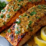 - Serve: Once the salmon is cooked, drizzle the warm lemon Dijon sauce over the fillets, sprinkle with chopped fresh parsley, and serve immediately with lemon wedges on the side for extra brightness.
