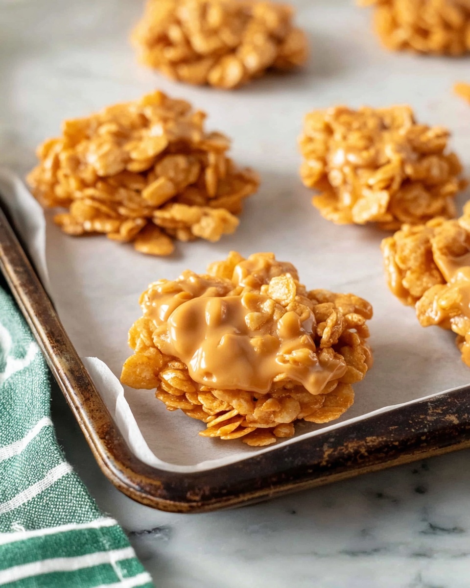 5. Form cookies: Drop spoonfuls of the coated cornflake mixture onto the prepared baking sheet, spacing them slightly apart to allow setting.