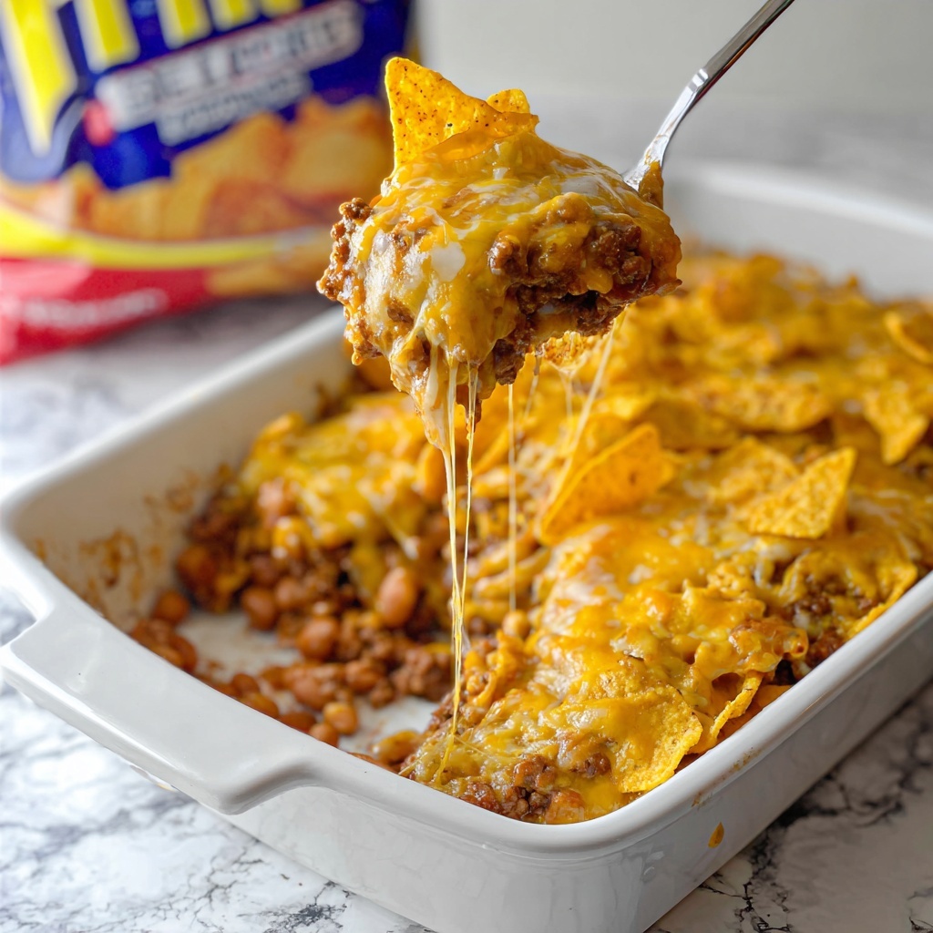 Grab your prepared baking dish and start by spreading 4 cups of Fritos in an even layer on the bottom. Sprinkle 1 cup of the shredded Mexican cheese blend over the chips. Spread the meat mixture evenly over this cheesy chip base, then top with the remaining cup of cheese. This layering is the secret to the perfect texture contrast in every bite.