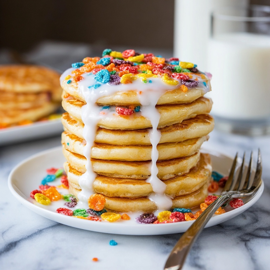 Pair your Fruity Pebble Pancakes with a side of crispy bacon or breakfast sausages for a savory contrast, or keep the meal playful and sweet with fresh fruit or yogurt for balance.