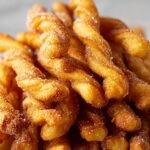 Crispy and sweet funnel cake fries, perfect for a fun and delicious treat. These deep-fried strips of funnel cake batter are dusted with powdered sugar, offering a delightful twist on the classic fairground favorite.