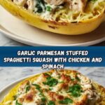 This Garlic Parmesan Stuffed Spaghetti Squash with Chicken and Spinach is a delicious and healthy meal that features tender roasted spaghetti squash filled with a savory mixture of sautéed chicken, garlic, fresh spinach, and creamy cheeses. Perfectly seasoned with Italian herbs and a touch of red pepper flakes, this dish is both comforting and nutritious, ideal for a wholesome weeknight dinner.