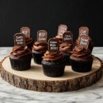 - Decorate the cupcakes: Frost each cooled cupcake generously with the chocolate frosting. Melt the Baker’s white chocolate and use it to create designs on the chocolate-coated graham crackers to mimic gravestones. Insert one decorated graham cracker into each cupcake to complete the graveyard effect. Optionally, you can add additional details by piping or decorating with crumbled cookies or green-colored sugar for grass.