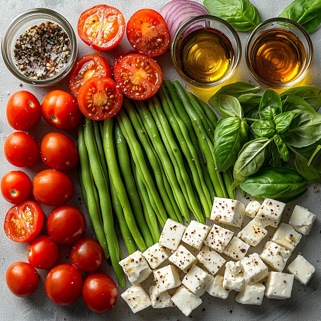A refreshing and vibrant Green Bean Salad featuring tender green beans, juicy cherry tomatoes, and creamy feta cheese, all tossed in a tangy honey vinaigrette. Garnished with toasted almonds and fresh basil, this salad is perfect as a light side dish or a healthy snack.