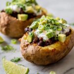 Once the sweet potatoes are done baking and cool enough to handle, slice them lengthwise down the middle, being careful not to cut all the way through. Use a spoon to gently press down the flesh, creating a nice well to hold all your filling. Add a sprinkle of salt and pepper to the potato itself for extra seasoning if you like. Then, spoon your black bean mixture evenly into each potato. Top with chopped avocado, a dollop of plain Greek yogurt, fresh chives, and if you’re feeling adventurous, some chopped cilantro for a vibrant finish.