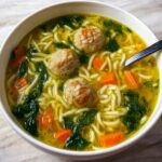 Italian Wedding Soup is a comforting and flavorful soup featuring tender meatballs simmered in a savory chicken broth with fresh vegetables and pasta. This classic Italian-American dish combines ground beef meatballs seasoned with Parmesan and herbs, hearty carrots and onions, and delicate orzo pasta, finished with fresh spinach or escarole for a nutrient-rich meal perfect for any season.