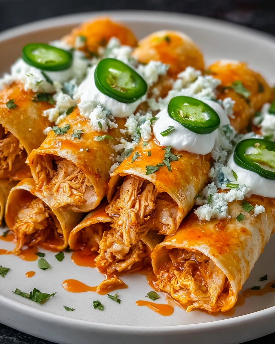 For a fun party platter, arrange your Jalapeño Cream Cheese Chicken Taquitos with Buffalo Sauce Recipe standing upright in a shallow bowl or basket lined with parchment paper. Drizzle extra buffalo sauce and ranch in zigzags over the top and scatter fresh herbs around for color. This presentation invites guests to grab and go with ease while making the table look festive and vibrant.