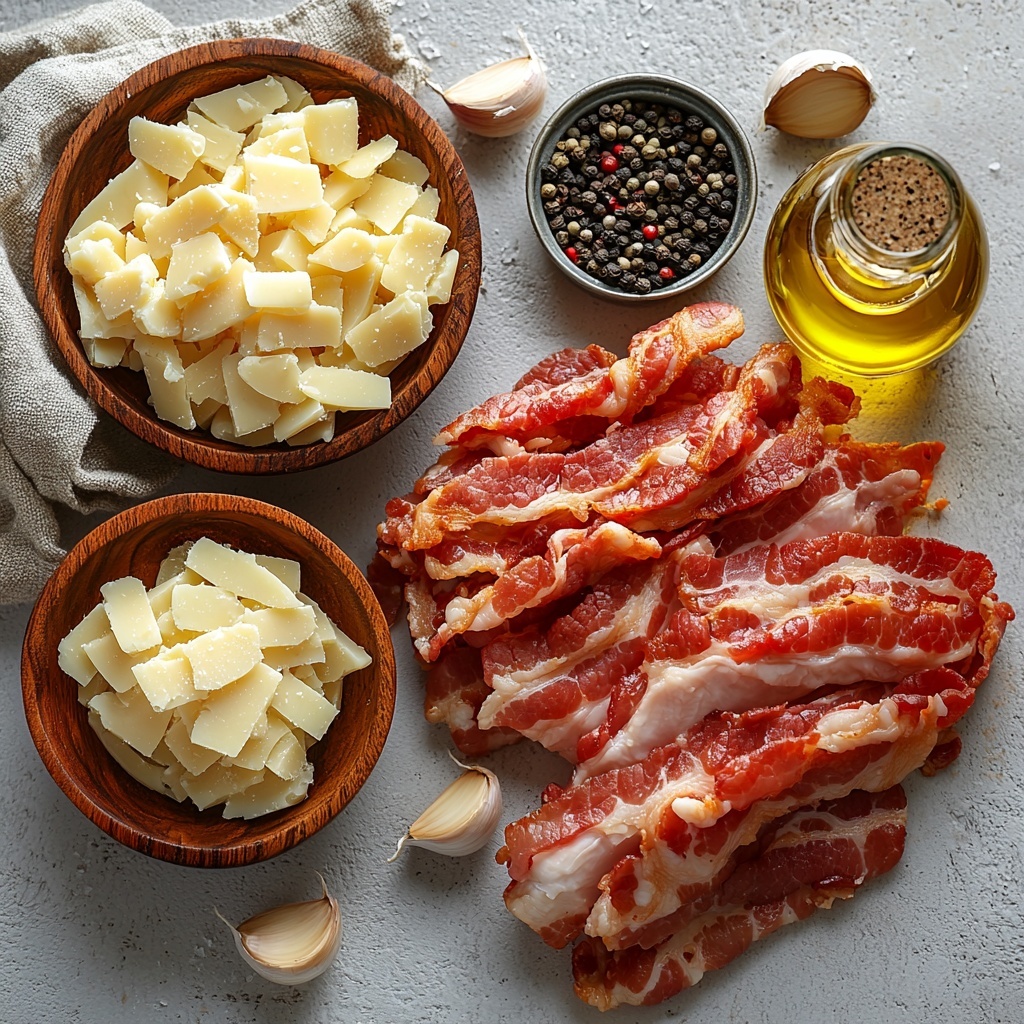 Gathering a handful of simple, fresh ingredients is all it takes to create this sensational meal. Each component plays a critical role, from the crispy texture of bacon to the fragrant aroma of sautéed garlic and the sharp, nutty kick of Parmesan cheese.