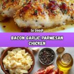 Savor the rich flavors of Juicy Bacon Garlic Parmesan Chicken, a quick and easy dish perfect for a weeknight dinner. Tender chicken breasts are seared to golden perfection, then topped with crispy bacon, aromatic garlic, and melted Parmesan cheese for a deliciously indulgent meal.