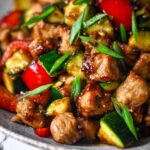 While the chicken marinates, chop your red and green bell peppers into squares for vibrant color and a crisp texture. Slice the zucchini into bite-sized pieces that cook just right, maintaining a slight snap. Chop the onion finely and set aside. Smash and mince the garlic, and grate or finely mince the fresh ginger separately. Keeping these ingredients ready ensures smooth cooking without rushing.