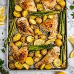 This Chicken Sheet Pan Dinner is a quick and easy one-pan meal featuring juicy, lemon pepper-seasoned chicken thighs and drumsticks, roasted alongside tender baby potatoes and fresh asparagus. With a bright blend of lemon zest, juice, and thyme, this savory sheet pan dinner is perfect for a hassle-free weeknight meal that requires minimal cleanup yet delivers bold flavors and crispy chicken skin.