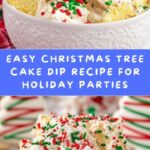 Top the dip with festive Christmas sprinkles for a burst of color and visual appeal. Then place the remaining Christmas Tree Snack Cake on top as a fun garnish. This touch adds texture and keeps the theme perfectly festive.