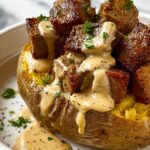 A hearty and flavorful Loaded Baked Potato with Steak Bites recipe combines perfectly baked russet potatoes topped with juicy, Cajun-seasoned steak pieces and a rich Parmesan cream sauce, finished with fresh parsley and a hint of lemon for a comforting, satisfying meal.