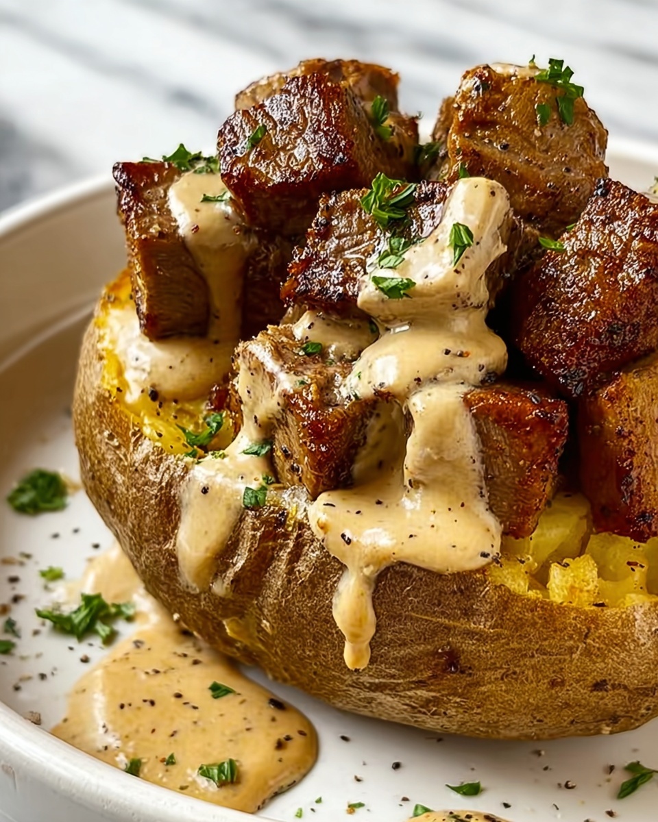 When the potatoes are ready, carefully slice them open and fluff the insides with a fork to create a cozy bed for all the delicious toppings. Pile on the seared steak bites generously, then lavish the whole thing with that heavenly Parmesan cream sauce. Each bite offers a crispy skin, a tender, savory steak piece, and that rich, cheesy sauce — pure comfort in every forkful.