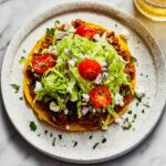 Now for the fun part—layer your tostada with a spoonful of warm refried beans, then pile on the savory ground beef mixture. Top with shredded iceberg lettuce, halved cherry tomatoes, chopped avocado, crumbled cotija cheese, and freshly chopped cilantro. Each bite is a delightful medley of textures and flavors that will impress everyone at your table. Serve immediately and enjoy the vibrant, satisfying feast you’ve created!