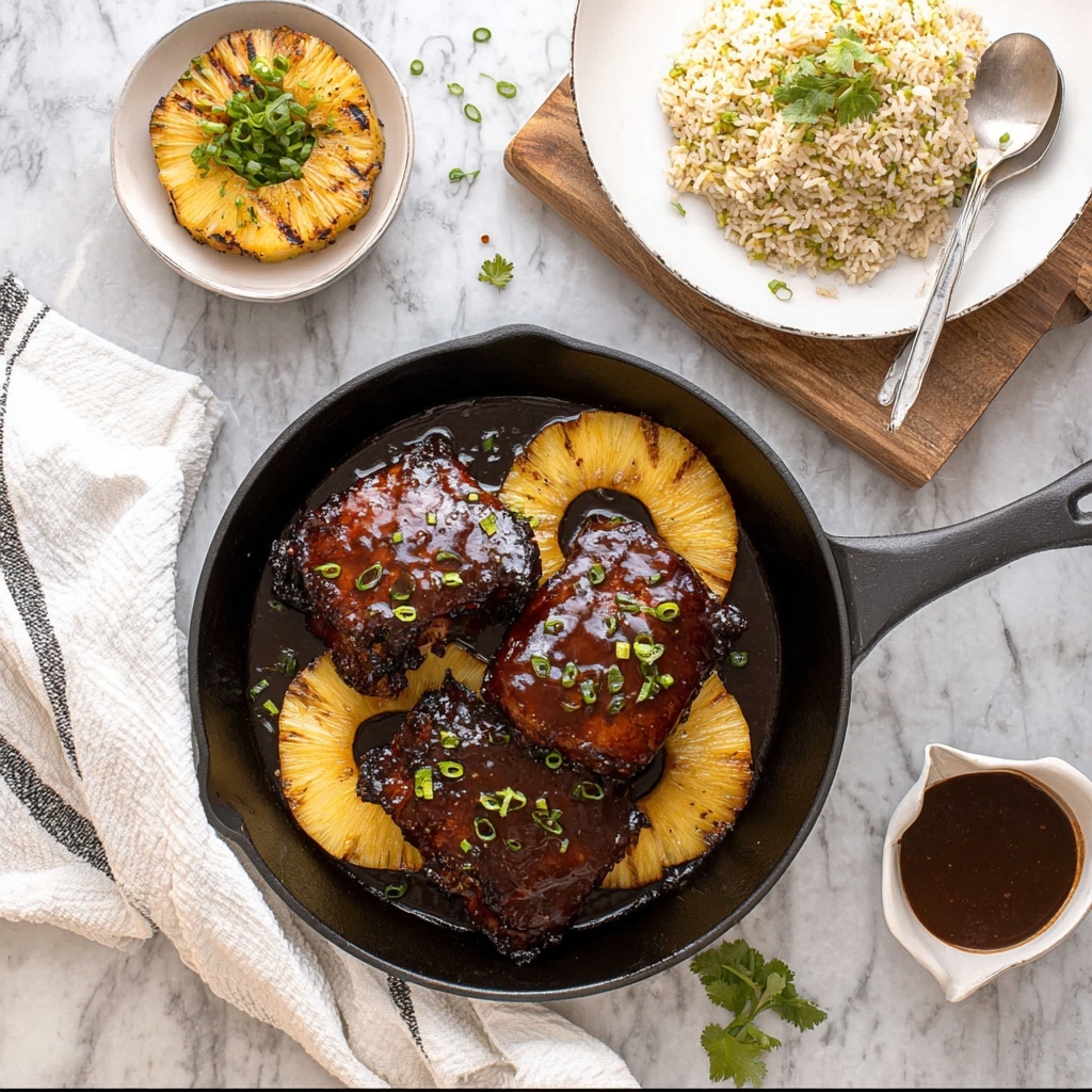 This Pineapple Pork Chops recipe offers a delightful blend of sweet and savory flavors that perfectly complement juicy, tender pork chops. The dish is cooked on the stovetop and features a tangy pineapple sauce made from pineapple juice, soy sauce, and brown sugar, served with caramelized pineapple rings. It’s an easy and flavorful meal ideal for a weeknight dinner that pairs beautifully with rice and fresh cilantro.