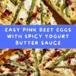 This vibrant and visually stunning recipe features hard-boiled eggs dyed pink by soaking in beetroot-infused water. Served atop a creamy garlic and lemon Greek yogurt base, the eggs are finished with a fragrant, spicy chilli butter drizzle and fresh herbs, creating a unique and flavorful appetizer or snack with Middle Eastern-inspired flavors.