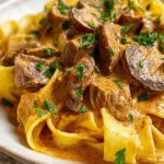 For a more elegant presentation, serve the stroganoff in shallow bowls with a sprig of fresh herbs on top. You can also plate it over mashed potatoes or creamy polenta instead of noodles for a twist. If you’re feeling fun, try stuffing halved bell peppers with the stroganoff filling and bake them for a playful, handheld option.