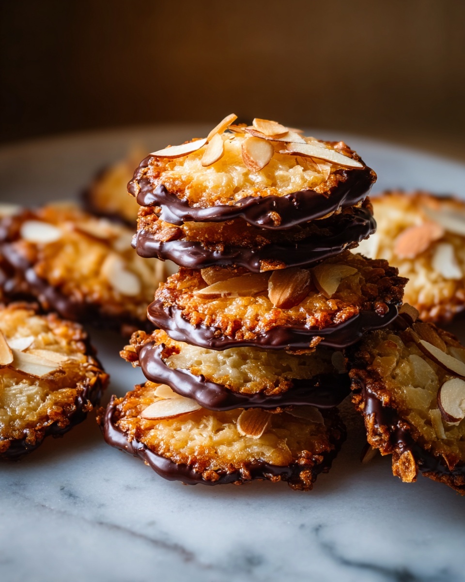 Quick Florentines are delicate, crisp almond biscuits made with a luscious caramel-like mixture crowned with a drizzle of rich dark chocolate. Perfect for an elegant teatime treat or a sophisticated dessert, these quick and easy cookies blend the nutty crunch of sliced almonds with buttery sweetness and a hint of vanilla.