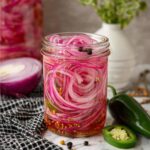 A quick and easy recipe for tangy and spicy Quick Pickled Red Onions, perfect for adding a burst of flavor to tacos, sandwiches, salads, and burgers. These pickled onions are made with a simple apple cider vinegar brine infused with spices and jalapeño, ready in just minutes and best after a few hours of refrigeration.