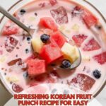 Hwachae is a refreshing Korean fruit punch that combines fresh and canned fruits with strawberry milk and a fizzy carbonated beverage to create a sweet, cooling drink perfect for warm weather or festive occasions.