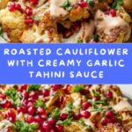 For a festive touch, serve the roasted cauliflower on a large, colorful platter and allow guests to spoon on the garlic tahini sauce to their liking before sprinkling pomegranate seeds. Another fun idea is to make individual bowls topped with a dollop of yogurt or labneh alongside the tahini for extra creaminess.