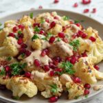 This flavorful recipe features perfectly roasted cauliflower topped with a creamy garlic tahini sauce and garnished with fresh pomegranate seeds and herbs, creating a delightful combination of savory, nutty, and sweet flavors. Ideal as a side dish or a light vegetarian main, it’s both simple to prepare and visually stunning.
