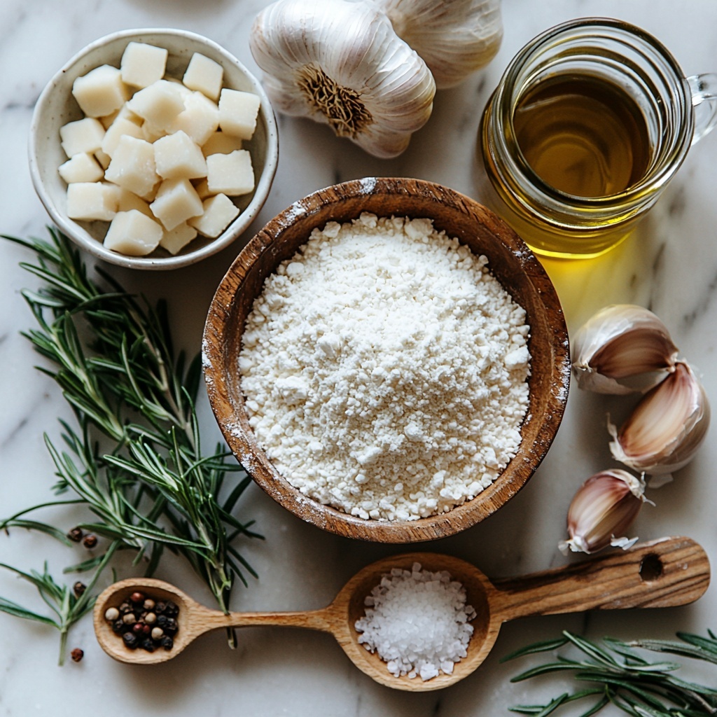 The magic of this Rustic No-Knead Rosemary Garlic Bread Recipe lies in its simplicity — just a handful of everyday ingredients combine to create a loaf bursting with flavor and beautiful texture. Each ingredient plays a crucial role, from the flour that forms the bread’s hearty base to the fresh rosemary and garlic that provide an aromatic punch.